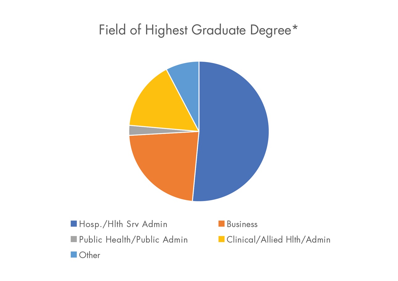 With a commitment to education and lifelong learning, 25 percent of our members have earned the esteemed FACHE® credential, the gold standard in healthcare management board certification that signals high competency, commitment and service to our profession. Additionally, 60 percent of our members have earned a Master’s Degree and another 25 percent hold two Masters or Doctorate degree. And while 52 percent of our members hold degrees in Hospital or Health Services Administration, nearly 23 percent hold business degrees, indicating competency in both organization and business acumen.